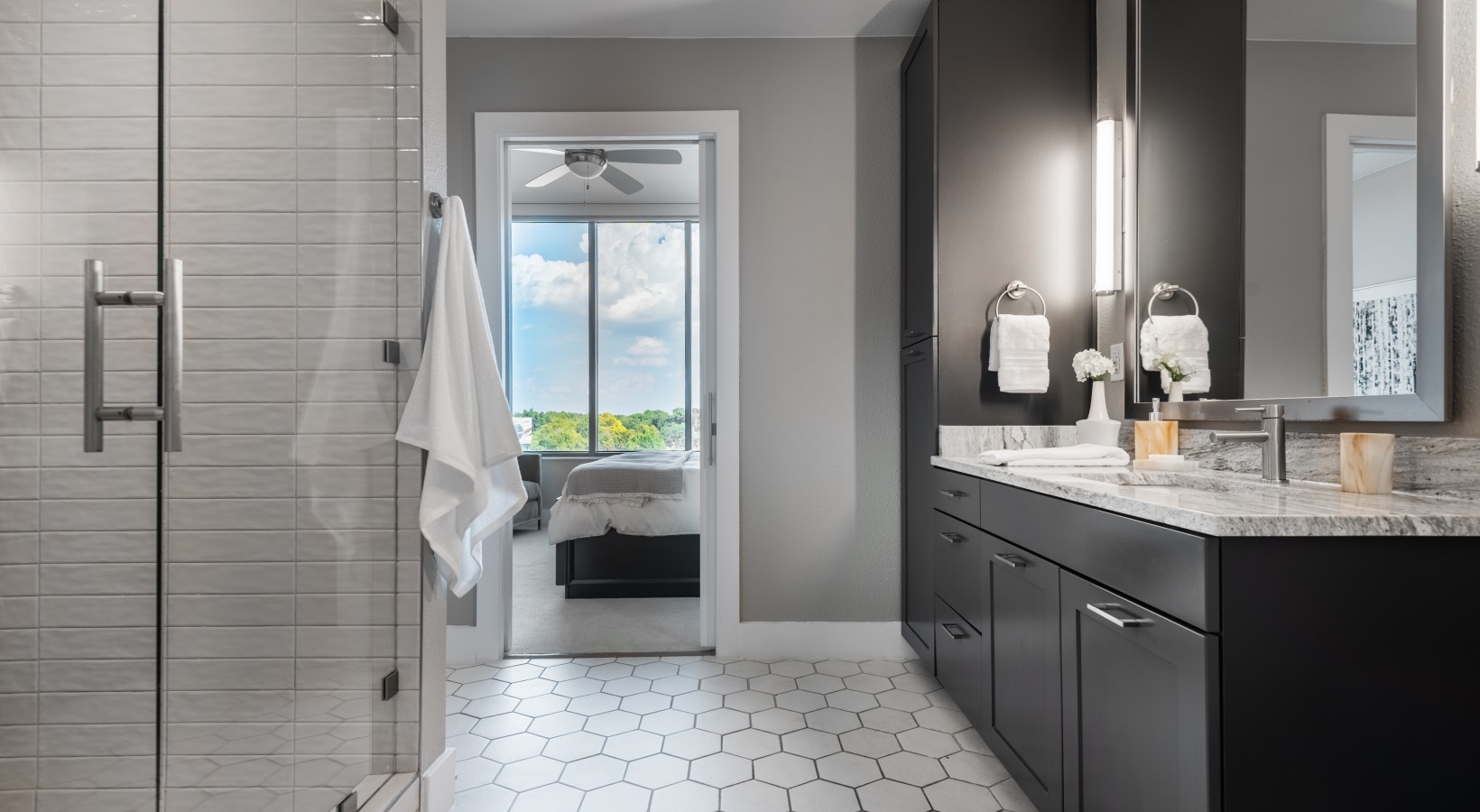 • Bath with dual vanities, custom cabinetry, quartz countertops and solid tile flooring
